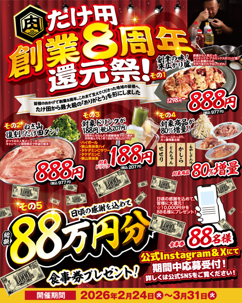 🔥🎉 たけ田 創業8周年 還元祭 開催!! 🎉🔥
